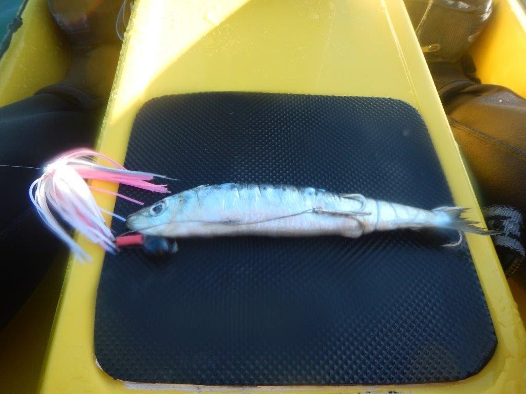 Diesel, Airwolf and I headed out from MG just after 5.30 am, across the river mouth and north just behind the backline. I was trolling a weighted pilchard (see photo of my rig) hoping to pick up some Tailor as there have been reports of these fish being caught by beach fishermen over the last few days along the North Shore. There was bait breaking the surface and some terns working, but no signs of any Tailor.